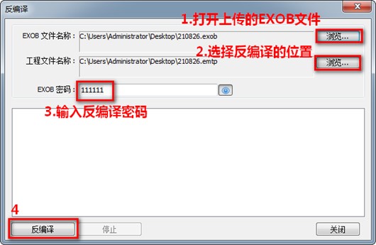 3. 彈出反編譯窗口,選擇需要反編譯的EXOB文件,接照1-4的順序操作,輸入正確的反編譯密碼,